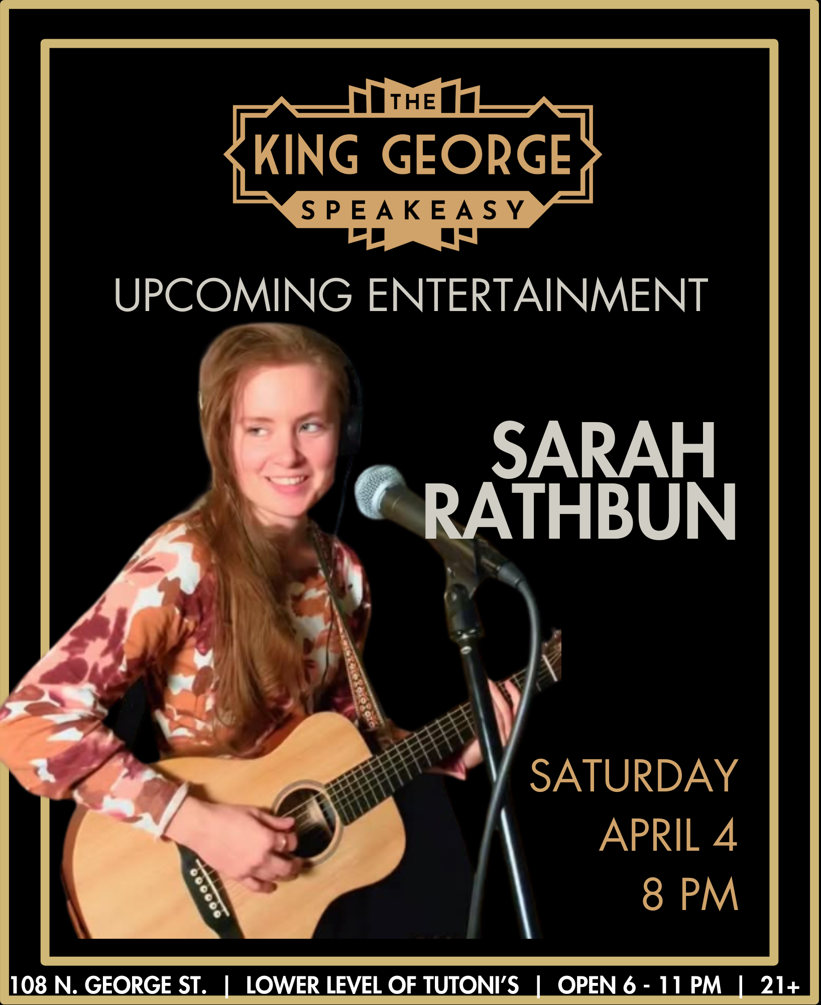 Sarah Rathbun brings her acoustic set to the King George, blending jazz, blues, pop, and fingerpicking with her own singer-songwriter roots in acoustic pop rock. With just a guitar, a mic, and a loop pedal, she builds layered, thoughtful sets that keep the room engaged without overpowering it.